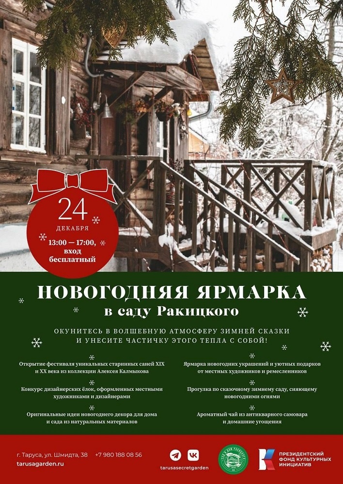 Окунуться в волшебную атмосферу зимней сказки и проникнуться теплом и энергией счастья приглашает Сад-дендрарий и дом-музей Ракицкого в Тарусе, который проводит 24 декабря Новогоднюю ярмарку. Местные художники и ремесленники представят свои авторские коллекции новогодних украшений и уютных подарков, которые они создали, вдохновляясь прошлым и настоящим сада, – это отличная возможность приобрести оригинальные подарки для родных и близких. Вход свободный.