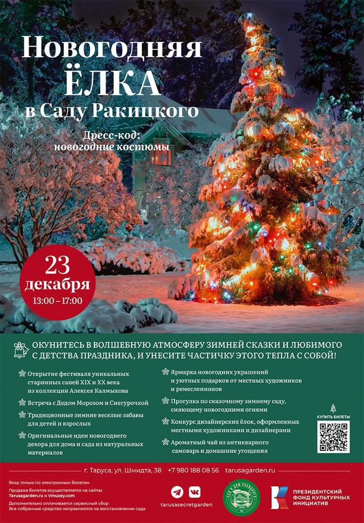 23 декабря в тарусской усадьбе Ракицкого проведут Новогоднюю ёлку! Гостей будут ждать весёлые зимние забавы, ярмарка новогодних украшений и подарков от местных художников, конкурс дизайнерских ёлок и открытие фестиваля старинных саней.