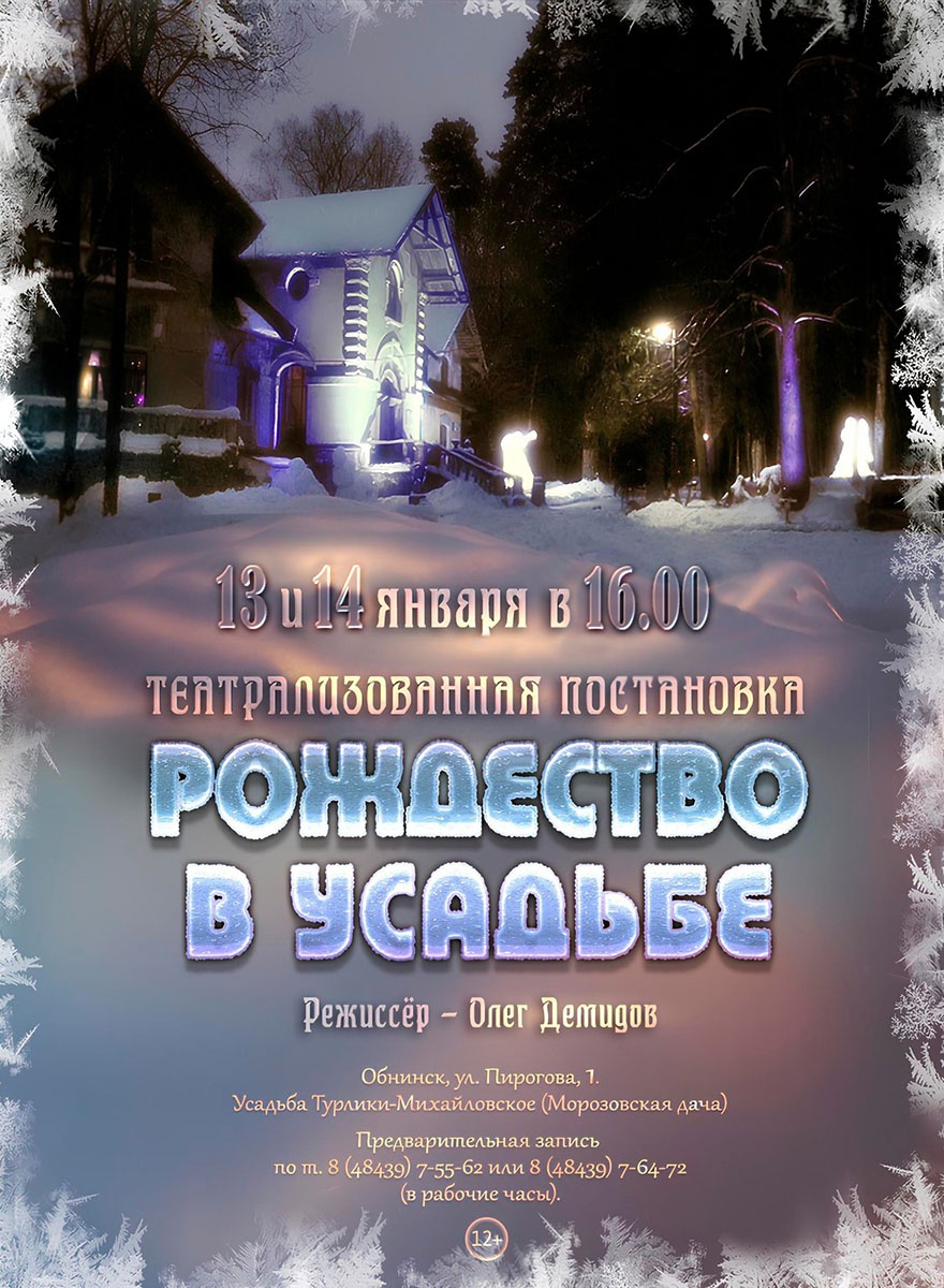 Морозовская дача, она же усадьба Турлики, она же усадьба Михайловское, встретит посетителей в рождественском праздничном убранстве. Новаторская подача исторического материала в интерьере усадьбы и окружающем её парке – интеграция современных технологий в театральное действо, «живая» музыка и живая ель с историческими игрушками, раритетный реквизит и даже настоящий конь для Маршала Победы – вызывают самые восторженные отклики у зрителей разных возрастов.