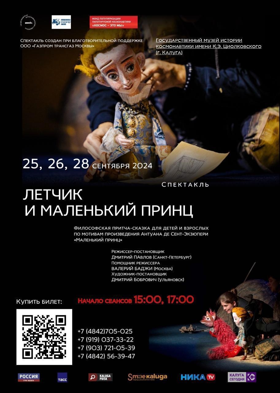 Государственный музей истории космонавтики им. К.Э. Циолковского в приглашает на спектакль «Летчик и Маленький принц» по мотивам произведения Антуана де Сент-Экзюпери «Маленький принц» 25, 26 и 28 сентября.