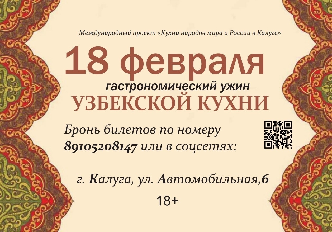 Международный проект «Кухни народов мира в Калуге» продолжается в 2023 году. 18 февраля «Амбассадор Холл» приглашает познакомиться с гастрономическими традициями Узбекистана.