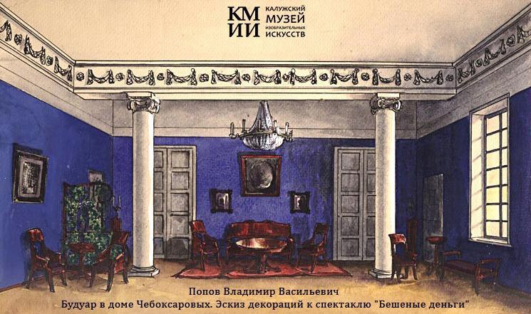 Выставка представляет не только декорации пьес драматурга, но и знакомит с его героями. Благодаря работам Владимира Васильевича Попова можно ощутить себя зрителями в театральной ложе. Перед нами герои спектакля «Бешеные деньги», сюжет которого повествует о судьбе и жизни совершенно разных людей, которых объединяет одно — жажда денег, богатства и праздной жизни. Усиливают эффект присутствия и работы художников П.М. Боклевского, К.П. Беггрова, английского художника Дедли Джона.