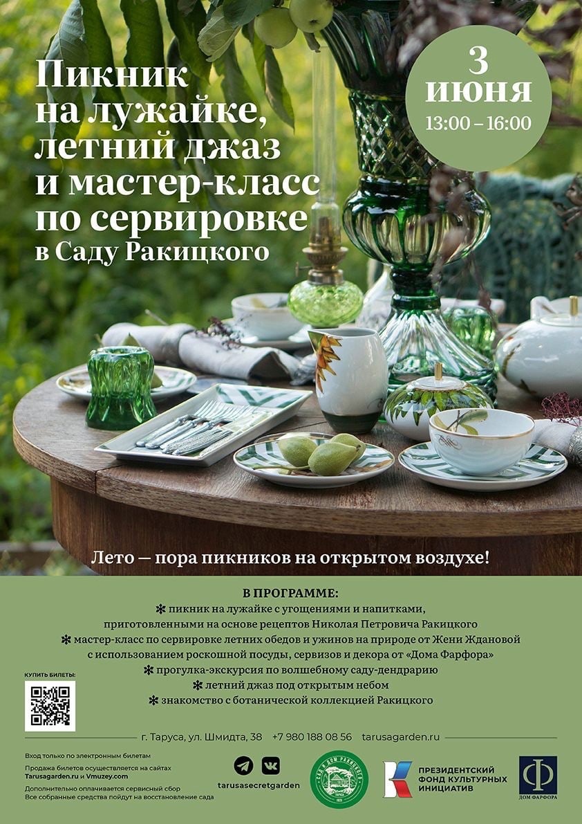 Наступает лето, а значит, начинается пора пикников на открытом воздухе! 3 июня на лужайке Сада Ракицкого в Тарусе проведут самый настоящий пикник – с легким джазом, мастер-классом по сервировке стола в саду и с фотосессией в самых прекрасных уголках усадьбы.