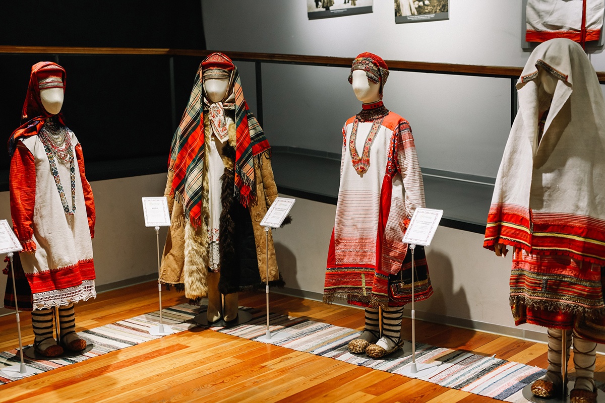 Коллекцию крестьянских нарядов, девичьих и женских, праздничных мужских рубах дополняют подлинные головные уборы, бисерные украшения и фрагменты вышивки, а также фотографии и авторские эскизы, рисунки и живописные работы на тему старинного калужского костюма.
