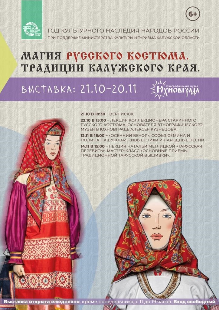 Выставочно-просветительский проект «Магия русского костюма» посвящен Году культурного наследия народов России и проводится при информационной поддержке министерства культуры Калужской области. Организаторы приготовили для гостей насыщенную просветительскую программу: лекции, мастер-класс, а также творческие встречи с художниками по костюмам. Расписание смотрите на афише.