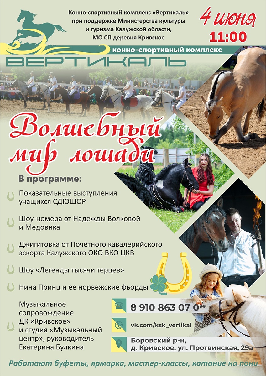 В рамках регионального событийного проекта «Сельское лето. Отдыхай в Калужской области!» 4 июня на территории конно-спортивного комплекса «Вертикаль» в Боровском районе состоится праздник «Волшебный мир лошади». На арену выйдут самые талантливые воспитанники конных центров округи, чтобы показать потрясающие по красоте номера и костюмированные трюки. Вход свободный.