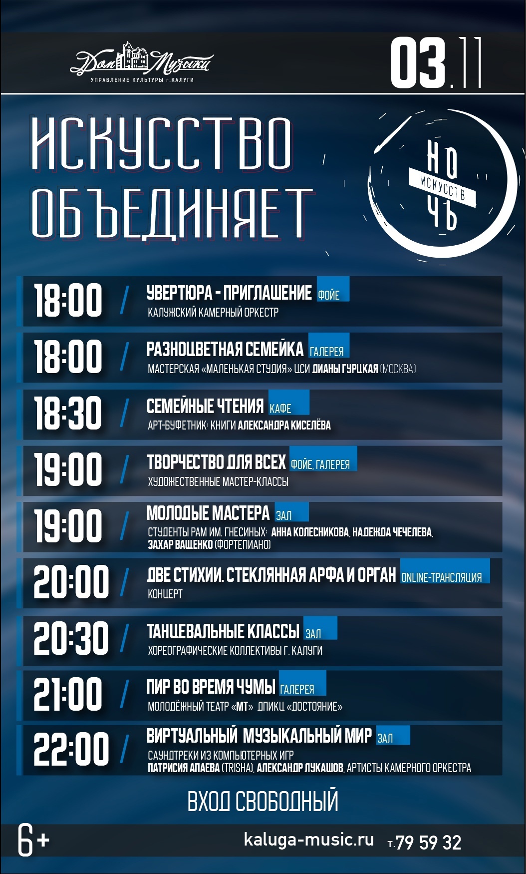 2, 3 и 4 ноября в Калуге, как и во всех регионах России, пройдет традиционная Всероссийская акция «Ночь искусств». В этом году мероприятия акции приурочены ко Дню народного единства и пройдут под девизом «Россия объединяет». Вечерний досуг предложат музеи, театры, выставочные и концертные залы, библиотеки и культурные клубы.
