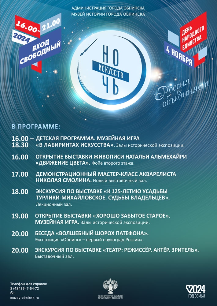 В 20.00 состоятся завершающие события «Ночи искусств»: беседа «Волшебный шорох патефона» об истории звукозаписи, в ходе которой при помощи патефона можно будет услышать записи ярких исполнителей советской эстрады 1930-х – 1950-х годов; а в выставочном зале пройдёт экскурсия по яркой выставке «Театр: Режиссер, Актер, Зритель», посвящённой юбилею Обнинского народного драматического театра и 100-летию его бессменного руководителя В.П. Бесковой (на выставке работают фотозоны).