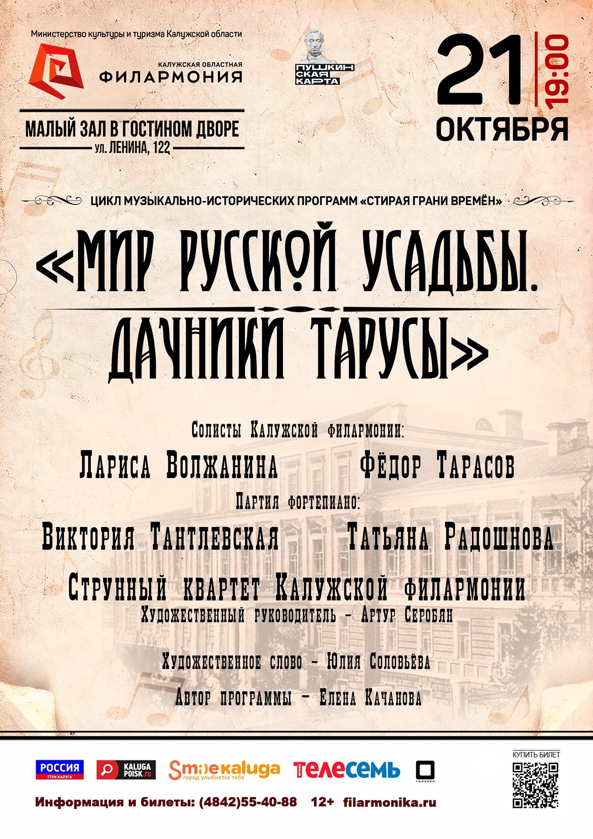 В продолжение музыкально-исторического цикла «Стирая грани времён» 21 октября Калужская областная филармония представит новую программу «Мир русской усадьбы. Дачники Тарусы». Автор программы — краевед и экскурсовод Елена Качанова.