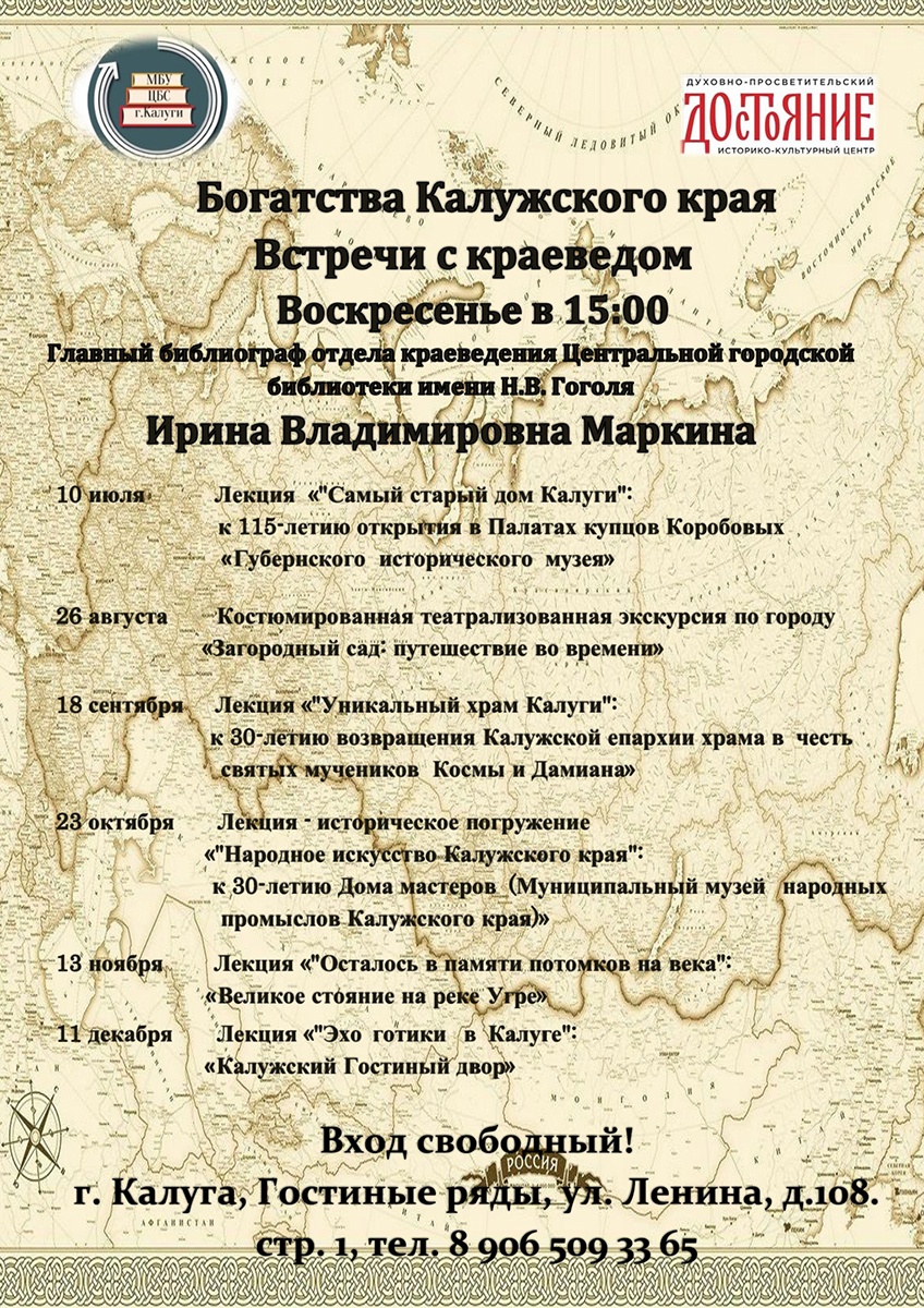 Еще один краеведческий проект стартует 10 июля. По воскресеньям в 15:00 в духовно-просветительском историко-культурном центре "Достояние" краевед, экскурсовод, библиограф Ирина Маркина прочитает лекции в рамках проекта "Богатства калужского края. Встречи с краеведом". Афишу смотрите в галерее анонса.