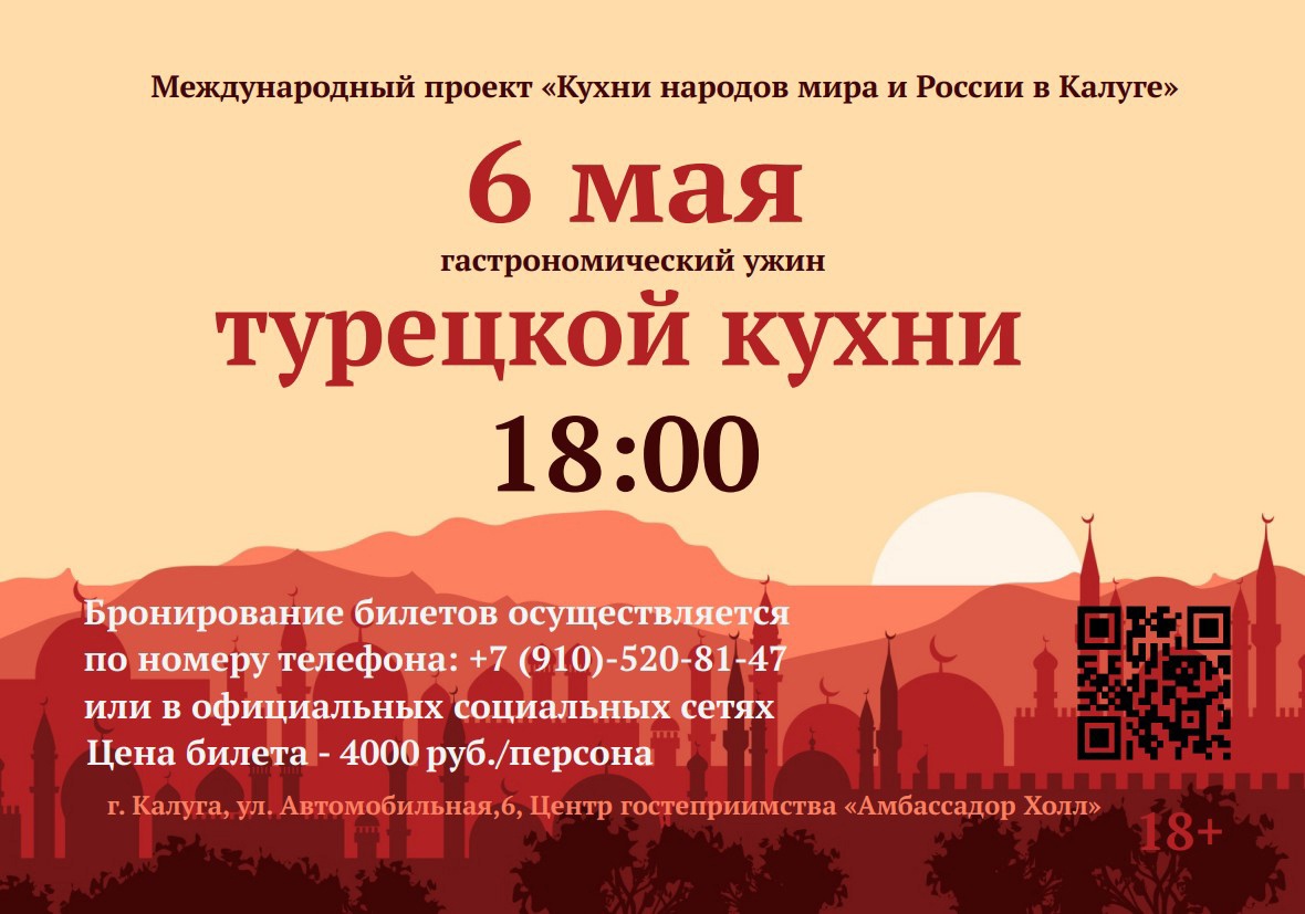 Гастрономическое путешествие в жаркую Турцию предлагает «Амбассадор Холл». Новый гастроужин международного проекта «Кухни народов мира в Калуге» состоится 6 мая.