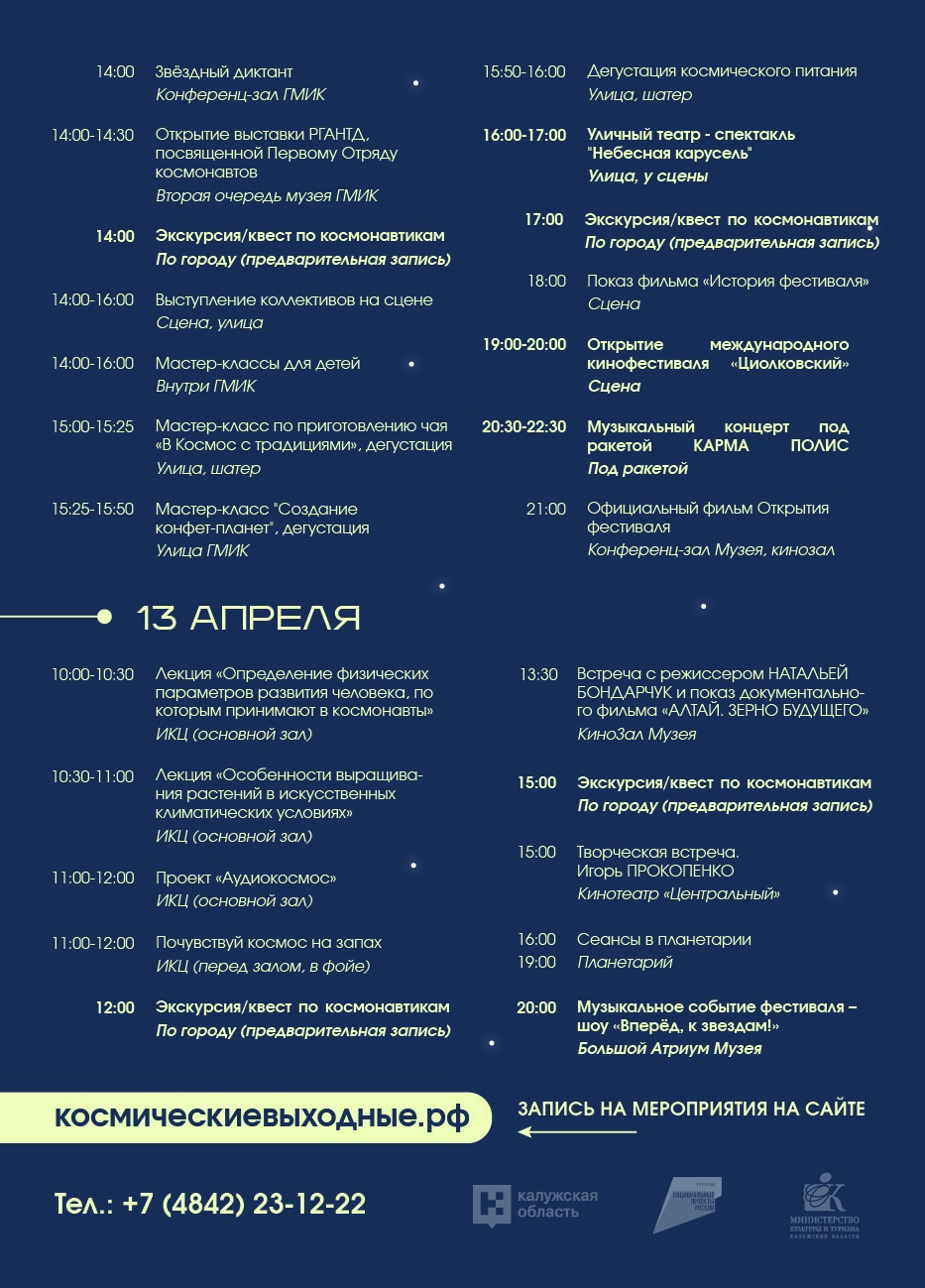 Одной из центральных площадок «Космических выходных» станет VI Международный кинофестиваль фильмов и программ о космосе "Циолковский", который продлится с 12 по 16 апреля. Гости смогут увидеть художественные, документальные, анимационные и полнокупольные фильмы о космосе, науке и исследованиях Вселенной, а также встретиться с кинематографистами и настоящими космонавтами. В этом году будут показаны 100 картин из 25 стран, а госкорпорация «Роскосмос» представит на кинофестивале свое трэвел-шоу «Россия космическая». 13 апреля состоится главное музыкальное событие фестиваля – шоу «Вперёд, к звёздам!» композитора и дирижера народного артиста РФ Павла Овсянникова, в котором примут участие все музыкальные коллективы Калужской областной филармонии, а также Калужский муниципальный камерный хор. (Важно! На все мероприятия 20 марта начнется регистрация на сайте https://space-fest.ru/ ).