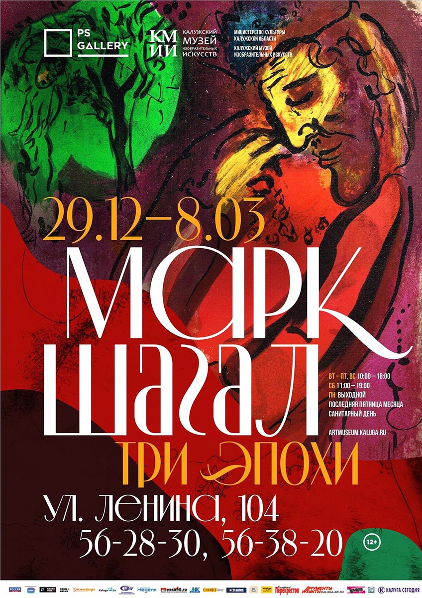 С 29 декабря в выставочном флигеле Калужского музея изобразительных искусств представлены графические серии всемирно известного русского и французского художника еврейского происхождения Марка Шагала - вместе они составили выставку «Три эпохи Марка Шагала».