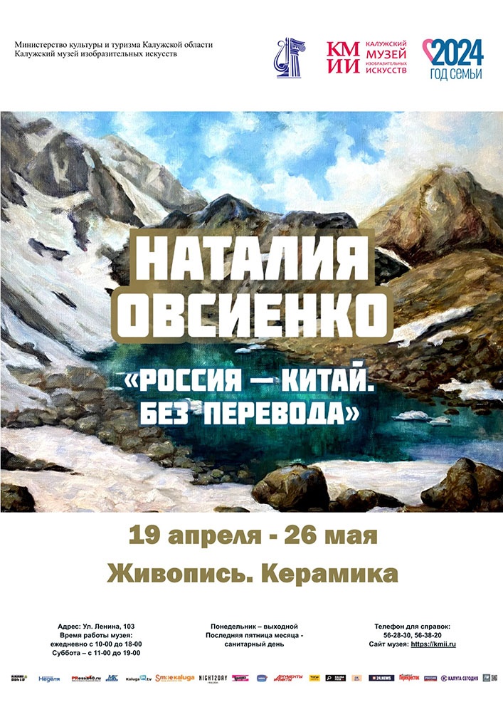 В Выставочном центре Калужского музея изобразительных искусств с 19 апреля работает выставка художника Наталии Овсиенко «Россия — Китай. Без перевода». Экспозиция приурочена к Году Китая в России и является третьим масштабным передвижным проектом заслуженного художника РФ Наталии Овсиенко в Калужской области — это рассказ о двух великих странах, их самобытных культурах, красоте и особенностях природных ландшафтов.