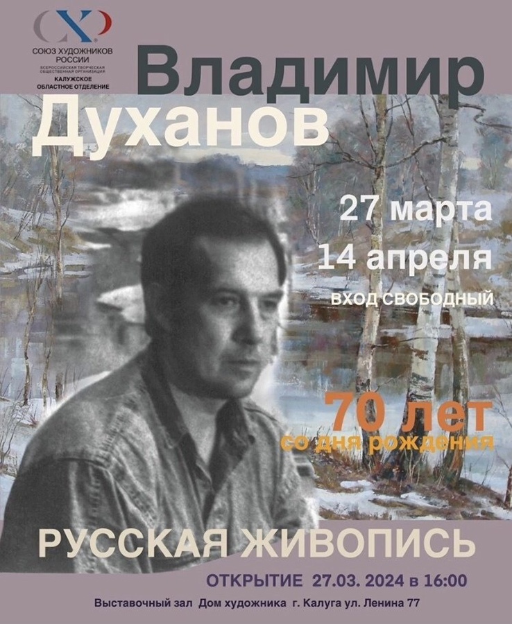 27 марта в выставочном зале Дома художника начала работу выставка «Русская живопись», посвященная памяти известного калужского живописца, члена Союза художников России Владимира Духанова, чье 70-летие со дня рождения Калуга отмечает в этом году.
