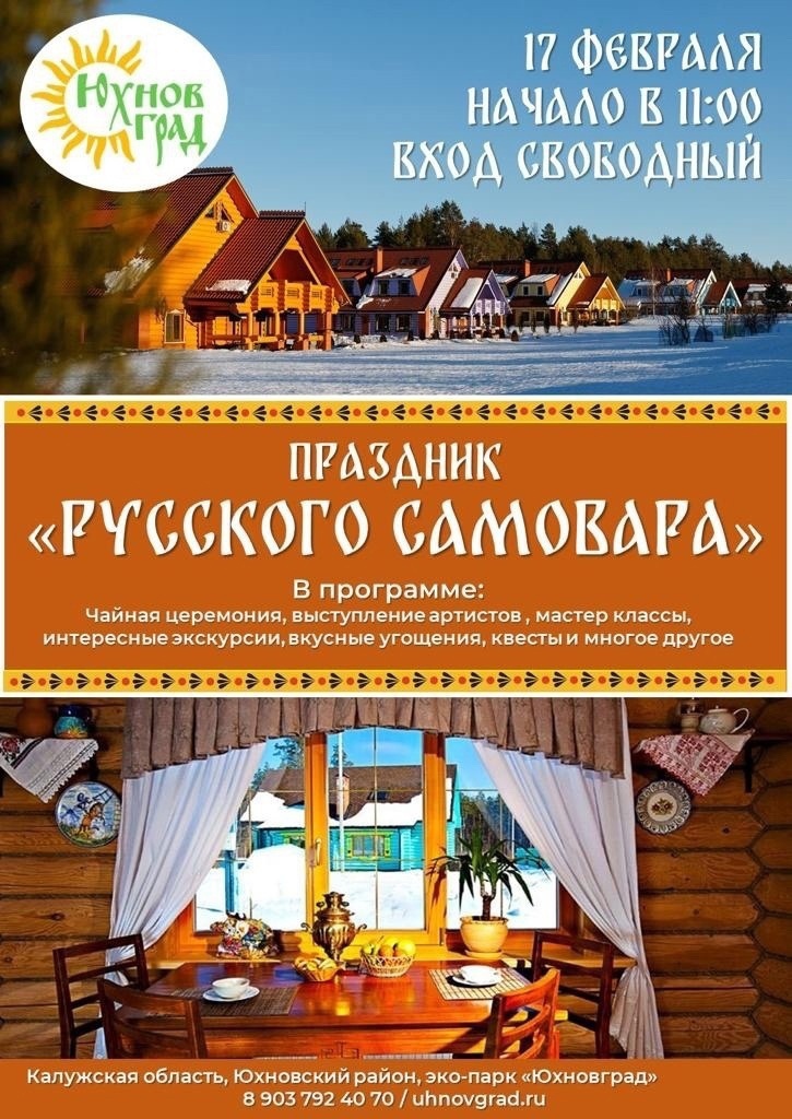 Экопарк «Юхновград», который предлагает размещение в русском стиле и на территории которого развивается масштабный этнографический проект, приглашает 17 февраля на праздник «Русский самовар», входящий в программу регионального событийного проекта «Калужская зима».