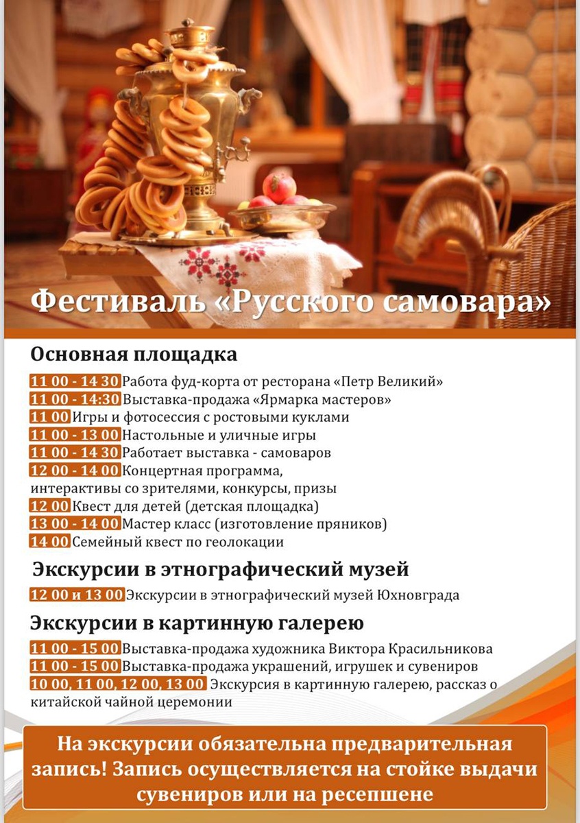 С русским песенным творчеством гостей праздника познакомит народный самодеятельный коллектив «Калужская тальянка». Другой участник – коллекционер и любитель чаепития с самоваром из Мещовска Борис Ильин, который поделится секретами растопки самоваров различных конструкций, традициями, сакральным смыслом чаепития с самоваром. И это еще не все!
