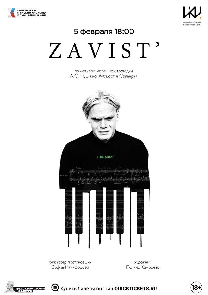 Для спектакля ZAVIST’ София Никифорова выбрала маленькую трагедию А.С.Пушкина, филигранно обнажившего величайший из людских пороков - зависть, столкнув в своем произведении двух музыкальных гениев – В.А. Моцарта и А.Сальери.