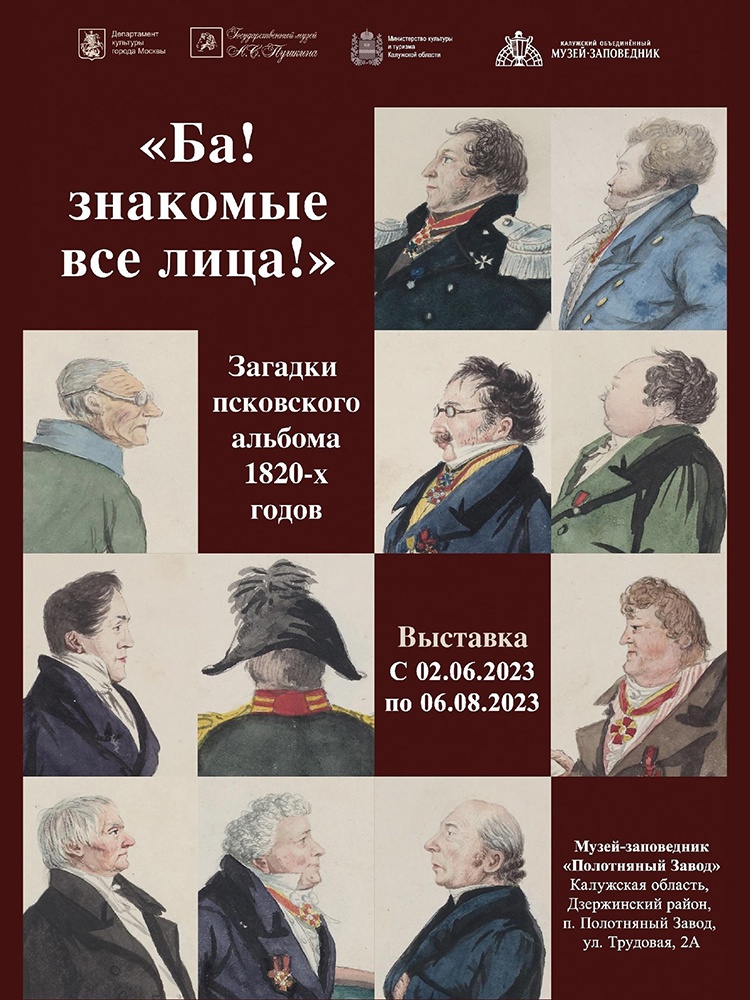 Выставочный проект «Ба! Знакомые все лица!» демонстрирует одно из уникальных изобразительных свидетельств начала 1820-х годов – альбом рисунков с 39 портретами, изображающими жителей Пскова, которые были знакомы с Пушкиным и являются героями Отечественной войны 1812 года. В 1996 году альбом, выполненный по заказу псковского губернатора, был приобретен Государственным музеем им. А.С. Пушкина. Бесценный экспонат хранит в себе немало тайн: почему на его обложке значится «г. Воронежъ в 30-хъ годахъ XIX столѣтiя» и кто же всё-таки является автором рисунков. Но кое-что совершенно ясно: рисунки позволяют узнать, кто окружал А. С. Пушкина в период его михайловской ссылки 1824-1826 годов.