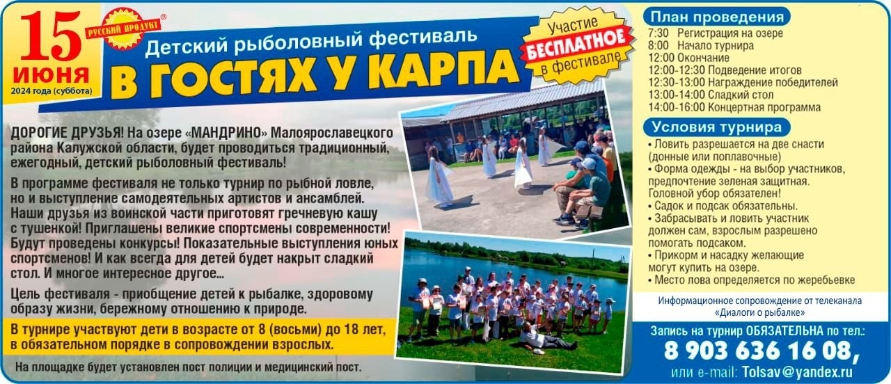 15 ИЮНЯ ПРОЙДЕТ ТРАДИЦИОННЫЙ ЕЖЕГОДНЫЙ ДЕТСКИЙ РЫБОЛОВНЫЙ ФЕСТИВАЛЬ «В ГОСТЯХ У КАРПА»!