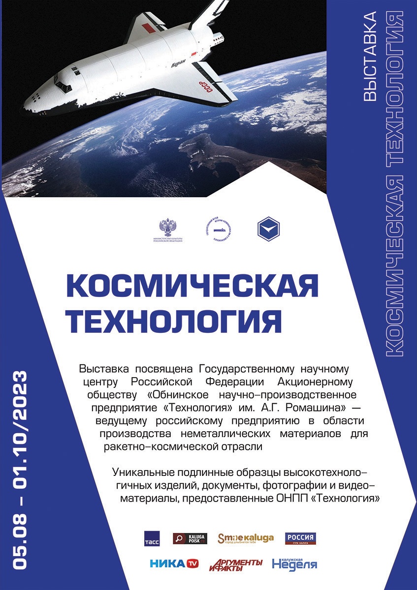 Выставка, посвященная Государственному научному центру Российской Федерации АО «Обнинское научно-производственное предприятие «Технология» имени А.Г. Ромашина», торжественно открылась 9 августа в Государственном музее истории космонавтики имени К.Э. Циолковского. Предприятие более 40 лет обеспечивает космическую отрасль высокотехнологичной продукцией из композитных материалов и участвовало в самых передовых проектах страны, таких как «Буран», Су-47, «Беркут», «Протон-М», «Рокот».