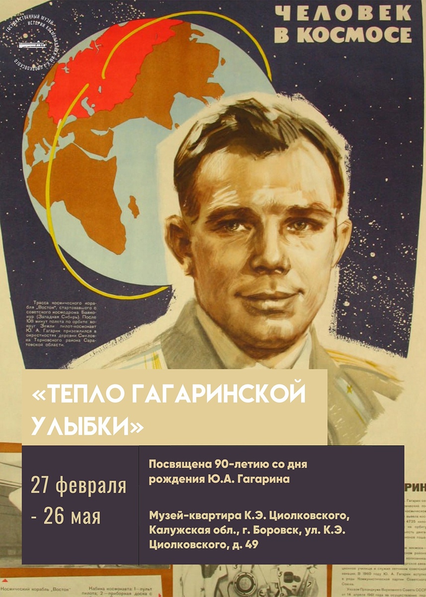 Со всех сторон, с каждого предмета на посетителя смотрит улыбающийся Юрий Алексеевич Гагарин – так с 8 марта в Музее-квартире К.Э. Циолковского в Боровске проходит выставка «Тепло гагаринской улыбки», посвящённая 90-летию со дня рождения Ю.А. Гагарина (1934-1968). О детстве и юности Гагарина, о подготовке космического полёта и самом полёте, о чествовании первого космонавта и сохранении памяти о нём рассказывают материалы из собрания ГМИК им. К.Э. Циолковского.