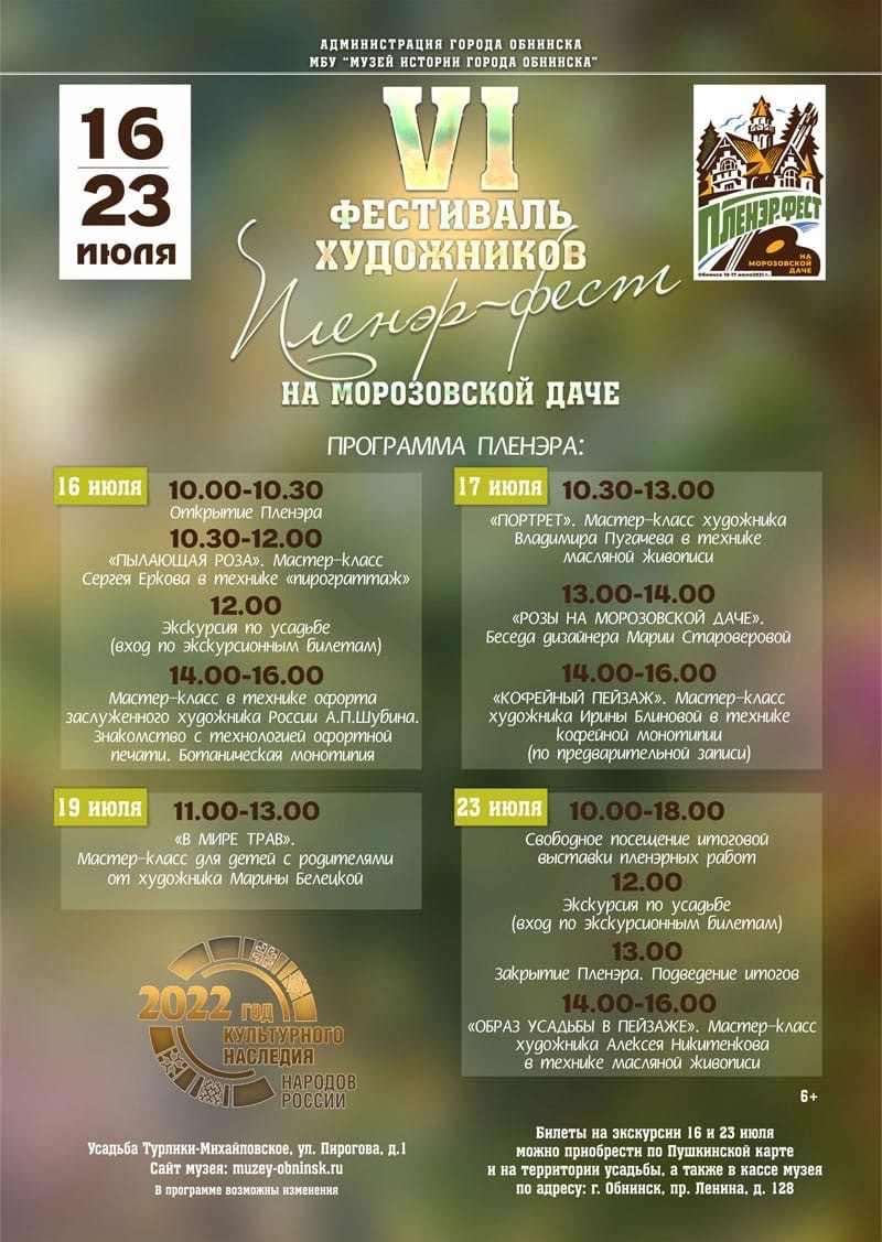 Профессиональные художники и любители порисовать, а также все, кто любит наблюдать за работой мастеров кисти, приглашаются на ежегодный фестиваль художников в Обнинск – с 16 по 23 июля в усадьбе Турлики проводится «Пленэр-фест на Морозовской даче». Кроме традиционного пленэра, в рамках фестиваля художники проведут мастер-классы и творческие встречи.