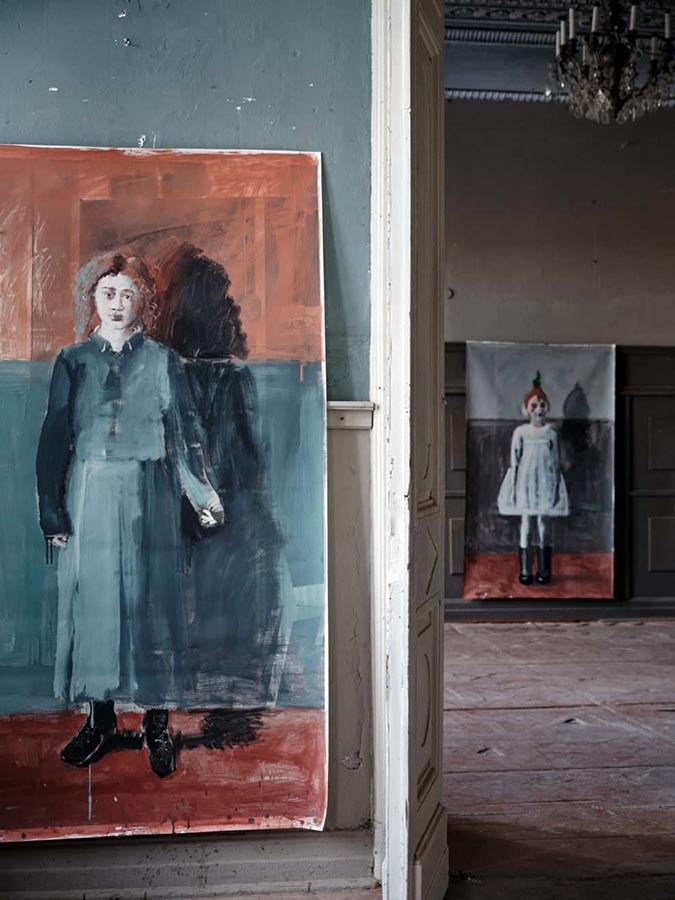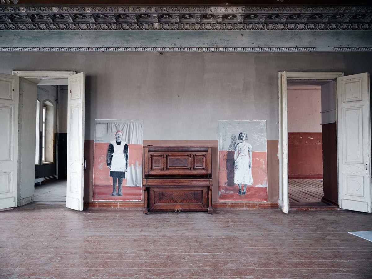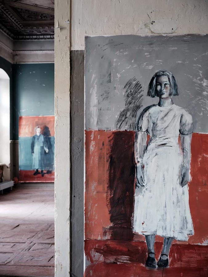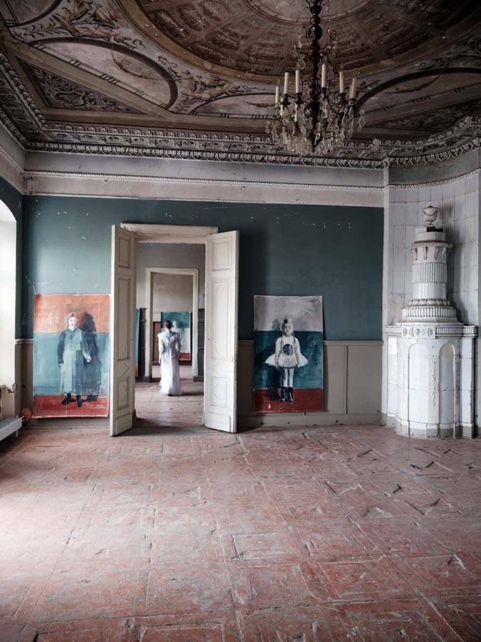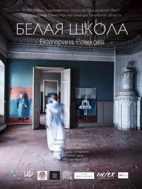 Художник Екатерина Рожкова разместила свои работы в залах и коридорах. «Белая школа» – проект о детстве: работы художницы дают возможность вернуться ненадолго в благословенное время детства и юности, где нет травм и обид, ни монстров-учителей. Дети, написанные художником, присутствуют тут как идеальные представители детства, как тени прошлого, которое есть у каждого из нас, как хранители дома. В анфиладе комнат - дети в карнавальных костюмах, в простых одеждах. Многие годы это был их дом. И может именно поэтому уцелел.