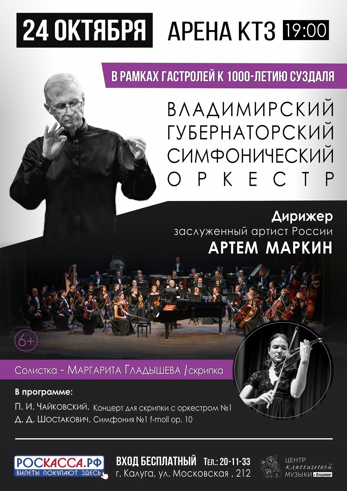 В рамках гастролей к 1000-летию города Суздаля 24 октября Калугу с концертной программой посетит Владимирский губернаторский симфонический оркестр. Насладиться классической музыкой в самом большом зале колыбели космонавтики, Арены КТЗ, можно бесплатно — это подарок Владимирской области к юбилею города-заповедника из Золотого кольца России.