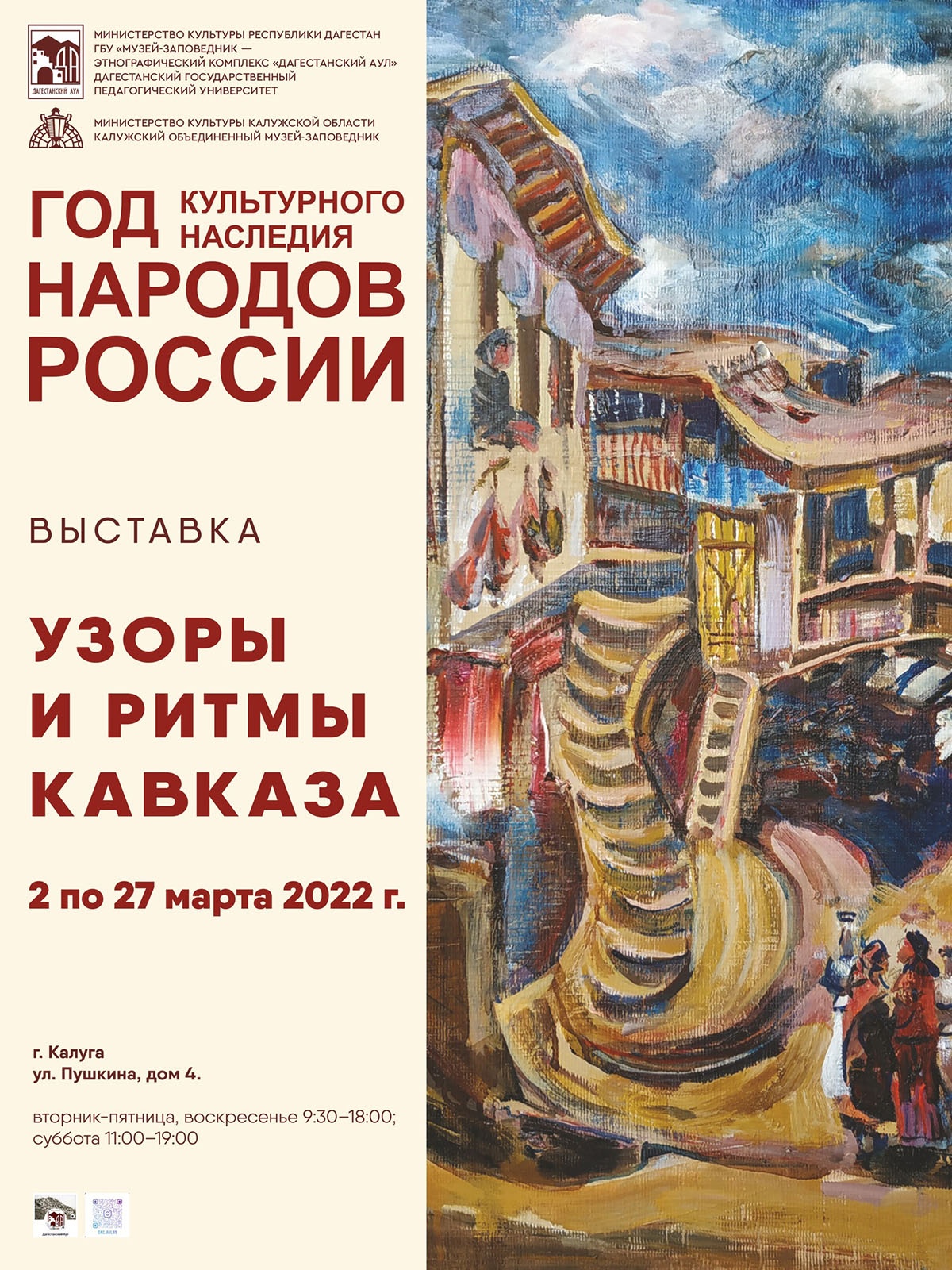 Выставка «Узоры и ритмы Кавказа» демонстрирует разнообразие, самобытность и богатство дагестанской культуры, отраженной в творчестве ведущих дагестанских художников, связь вековых традиций и современности.