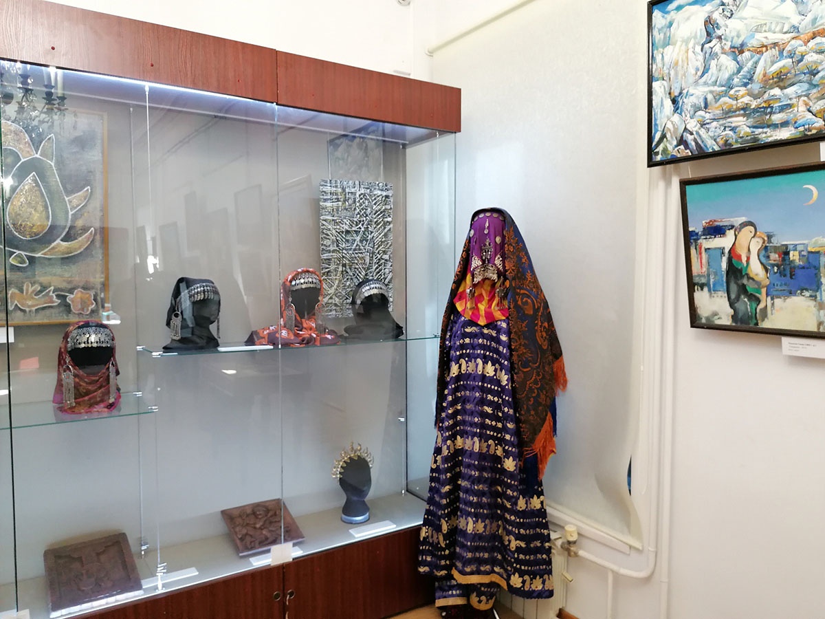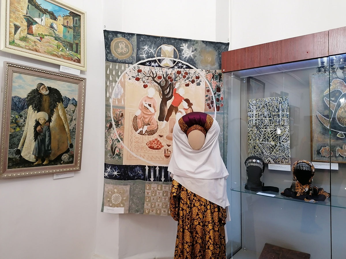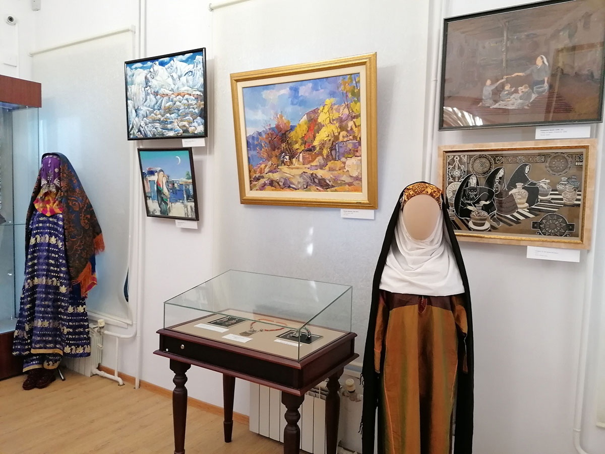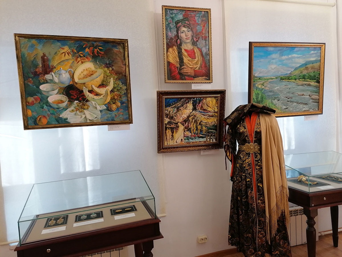 Наряду с живописными и графическими работами на выставке представлены предметы декоративно-прикладного искусства, ювелирные изделия и традиционные женские костюмы народов Дагестана, перекликающиеся со своим отражением на живописных полотнах.