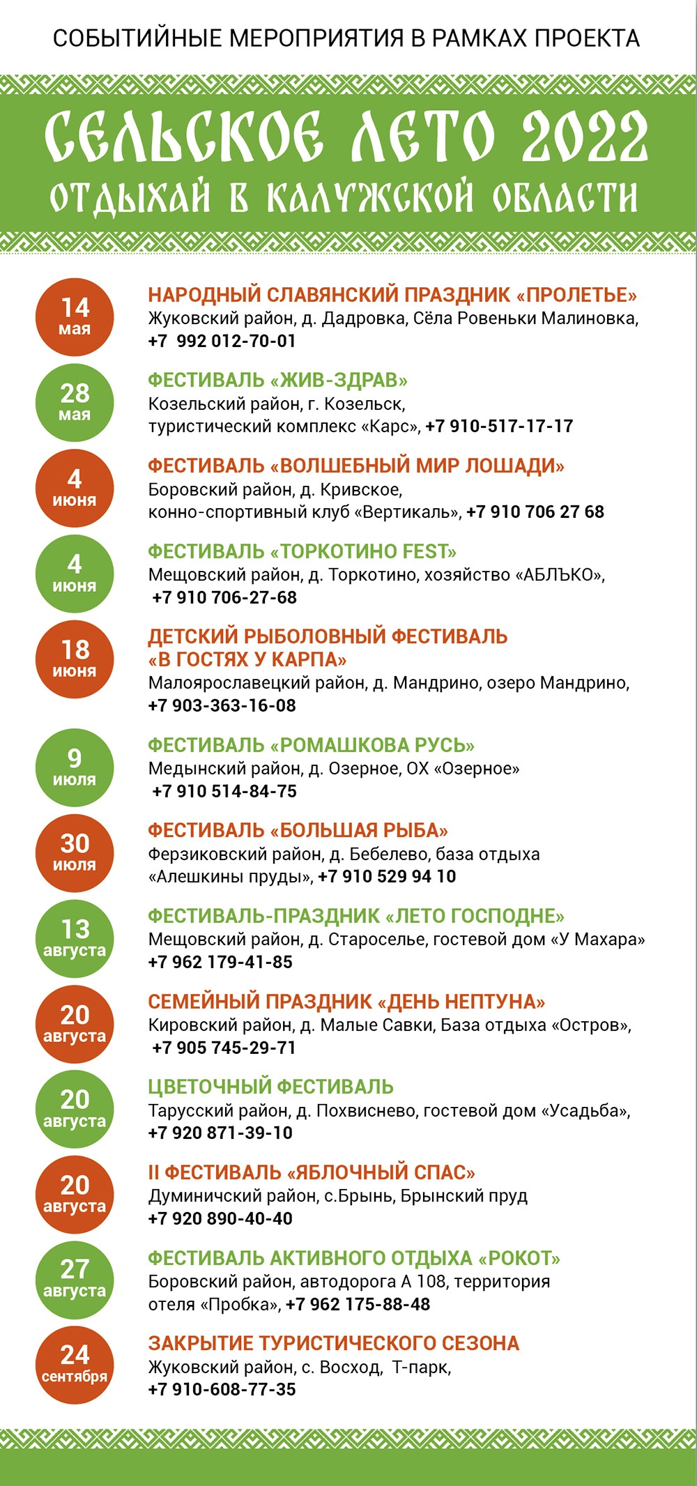 - 13 августа - Фестиваль-праздник «Лето Господне» (Мещовский район, д. Староселье, гостевой дом «У Махара»)