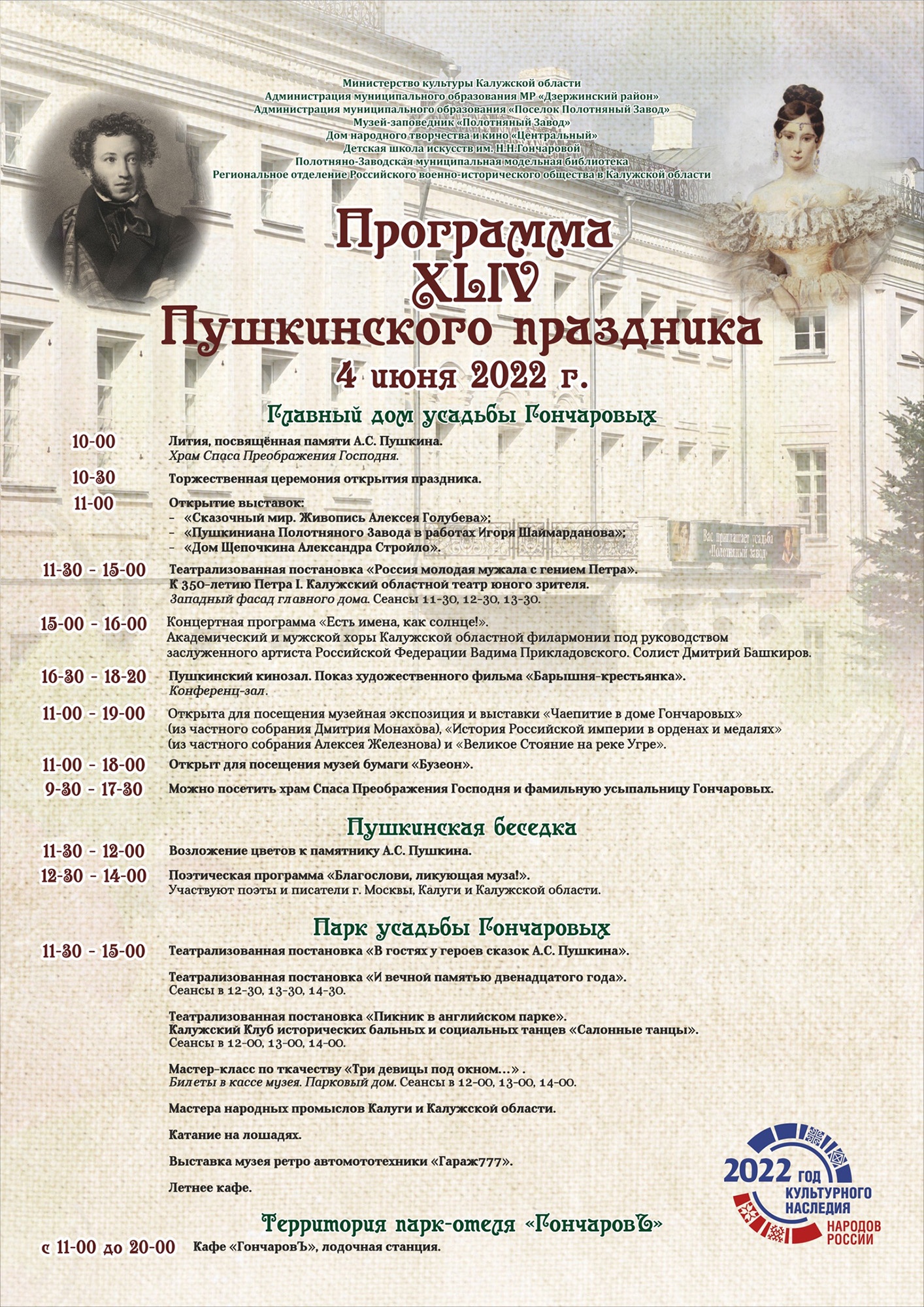 В 2022 году Пушкинский праздник 4 июня посвящен не столько великому поэту, сколько великому императору, с указа которого началась история Полотняного завода – и усадьбы, и поселка в Калужской области. В России отмечается 350-летие Петра Первого.