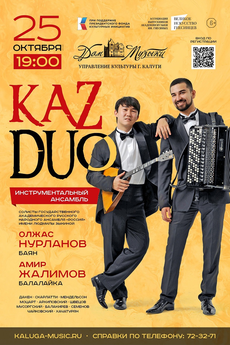 Ассоциация выпускников Академии музыки имени Гнесиных реализует масштабный проект всероссийского значения, направленный на популяризацию Гнесинской школы и педагогических идей ее основателя, Елены Фабиановны Гнесиной: в более чем 50 городах России будут проведены мастер-классы, лекции, концерты и гастрольные туры гнесинцев — выпускников, педагогов, учащихся и коллективов. В рамках проекта 25 октября на сцене Калужского дома музыки выступит дуэт KazDuo — это первый концерт проекта «Великое искусство Гнесинцев» в Калуге.