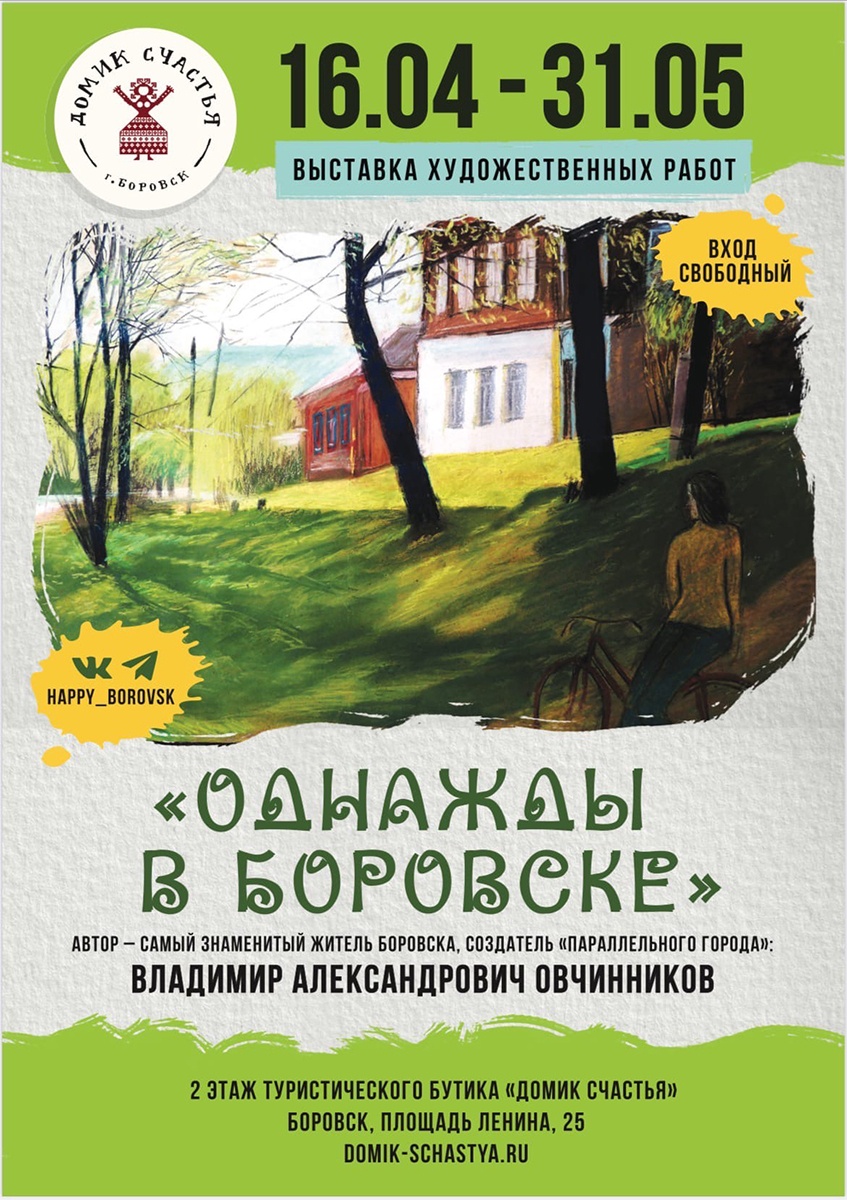 Самый знаменитый житель Боровска, создатель «параллельного города» Владимир Овчинников представил свои художественные работы в Домике счастья. Выставка «Однажды в Боровске» открылась 16 апреля.