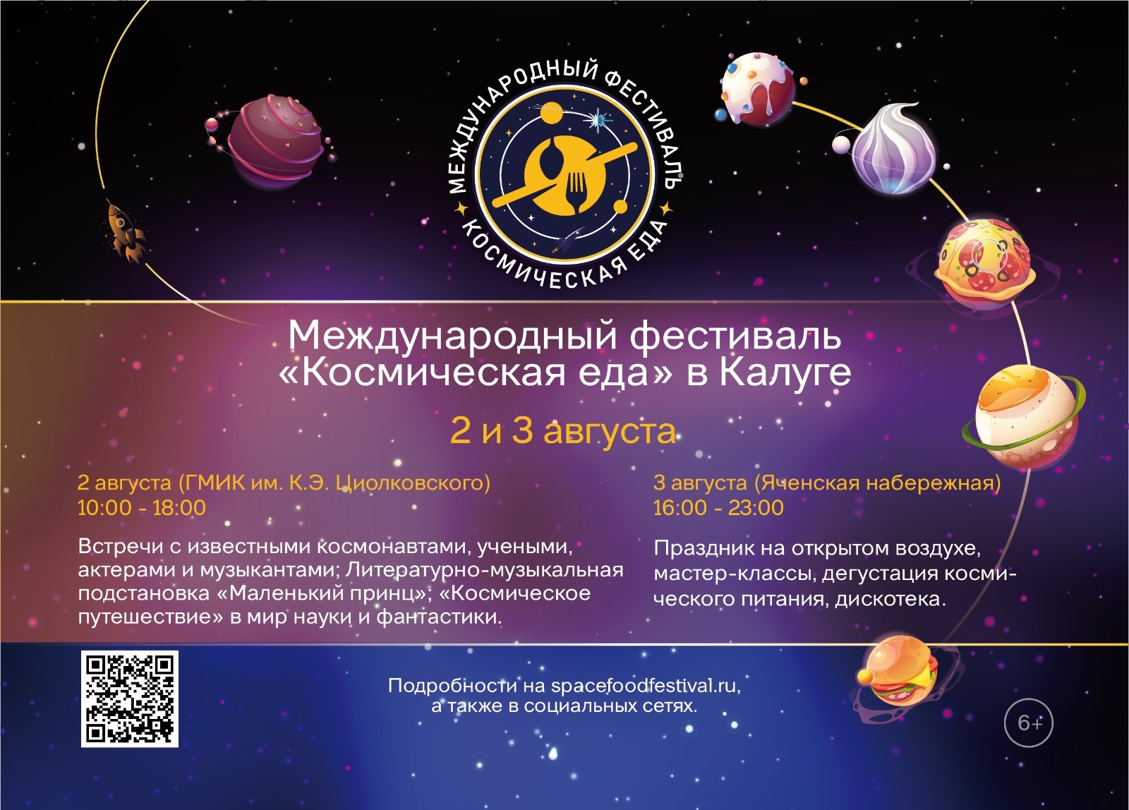 2 и 3 в Калуге уже во второй раз состоится международный фестиваль «Космическая еда». Фестивальными площадками снова станут Государственный музей истории космонавтики имени К.Э. Циолковского и открытая территория Яченского водохранилища. В первый день запланирована насыщенная образовательная программа, второй день будет посвящен культурным мероприятиям и дегустациям космического питания.