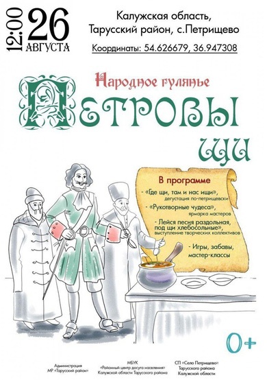 26 августа в селе Петрищево Тарусского района ждут всех желающих на народные гуляния «Петровы щи», посвящённые национальному русскому блюду. Как и в прошлом году, когда праздник был проведен впервые, всех гостей накормят щами «по-петрищевски».