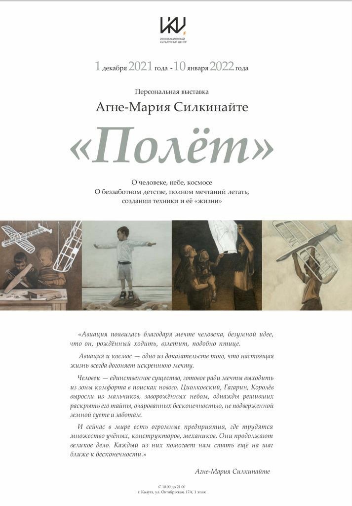 На границе двух космических юбилеев оказалась персональная выставка молодой художницы Агне-Марии Силкинайте, стартующая 1 декабря в Инновационном культурном центре. Выставка под названием «Полёт» завершает серию мероприятий, посвященных 60-летию первого полета человека в космос, и открывает цикл культурных событий, связанных со 165-летием К.Э. Циолковского, которое будет отмечаться в 2022 году. Также выставка является своеобразным анонсом десятого, юбилейного, фестиваля современного искусства «Циолковский фест»-2022, на котором Агне-Мария Силкинайте выступит титульным художником.