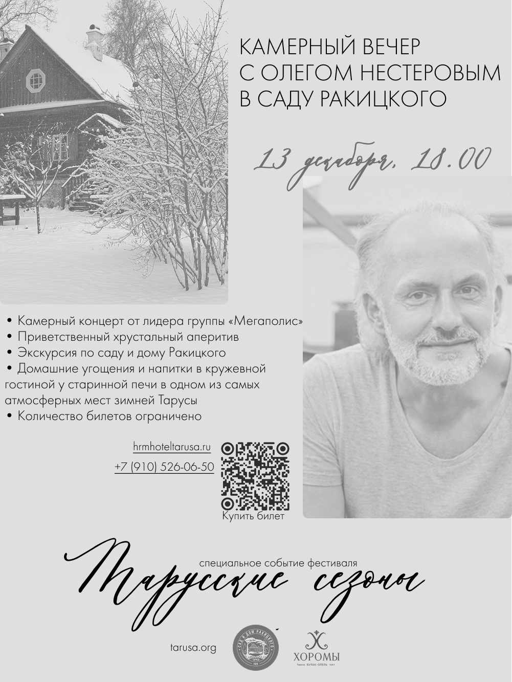 - 18:00 Камерный вечер с Олегом Нестеровым — лидером группы "Мегаполис". В программе: авторские композиции в акустическом исполнении, истории создания известных песен, живой диалог с музыкантом в камерной атмосфере.