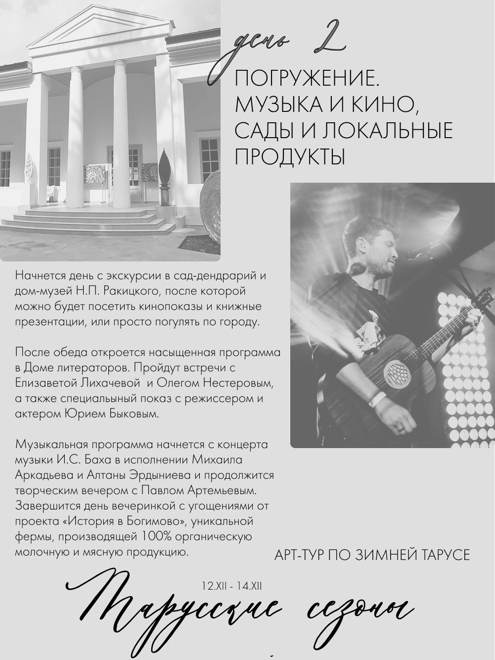 «Тарусские сезоны» — новый проект от Международного тарусского кинофестиваля, который открылся в 2024 году и стал знаковым культурным событием. Цель проекта — возродить Тарусу как центр российской культуры и создать основу для постоянного и органичного развития искусства, кино и литературы в малом городе. Именно традиции Тарусы, культурное наследие и история сразу нескольких семей, определивших нашу культуру в 20 веке, могут стать основой для новых арт-событий.