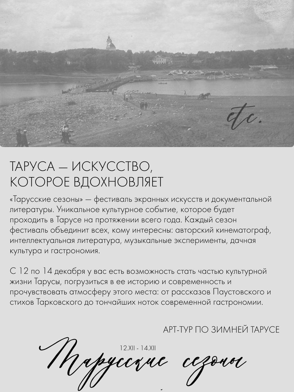 С 12 по 14 декабря в Тарусе пройдут «Тарусские сезоны» — фестиваль экранных искусств и документальной литературы. Это уникальное культурное событие, которое будет проходить в малом городе на протяжении всего года. Каждый сезон фестиваль будет объединять в малом городе всех, кому интересны авторский кинематограф, интеллектуальная литература, музыкальные и художественные эксперименты, дачная культура и гастрономия.