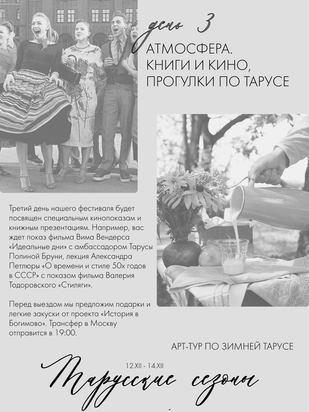 Частью фестиваля станут экскурсии по Тарусе, включая Сад Ракицкого и Дом Литераторов. На гастрономической карте фестиваля — кафе и рестораны Тарусы, а также локальные проекты — «Мой чай» и «Истории в Богимово».