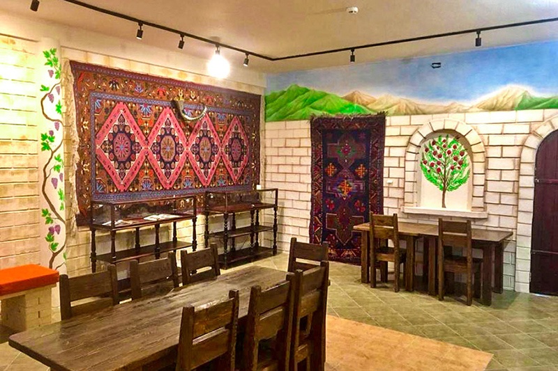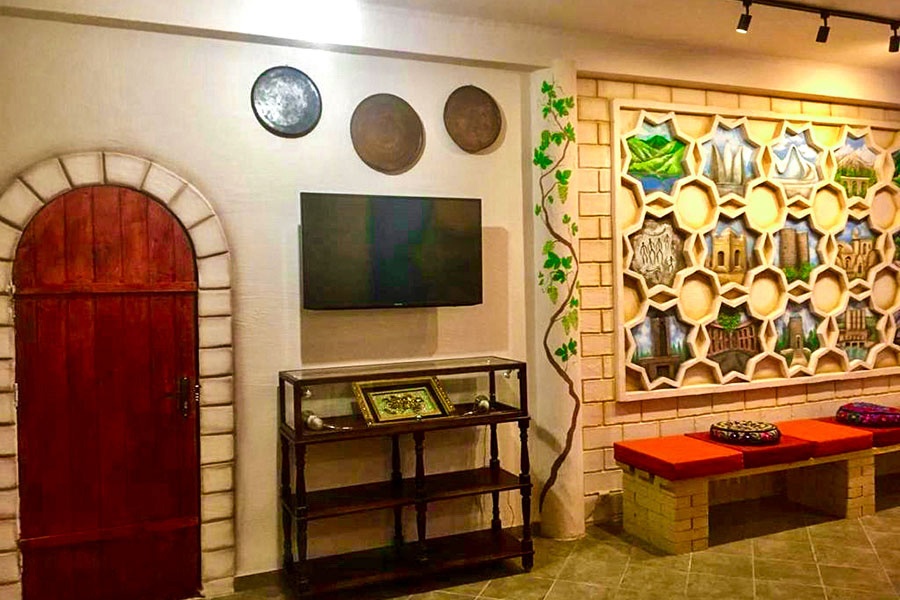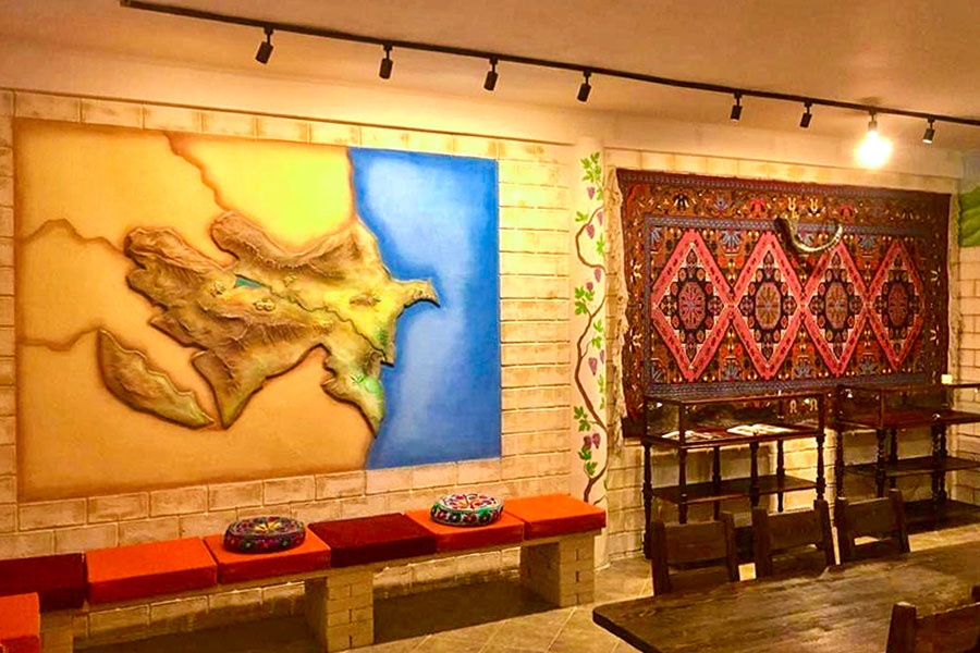 Интерьеры позволяют прикоснуться к культуре и традициям кавказской республики! Дом украшен росписью «Горы» и видами на Каспийское море. На левой стене внутри звёзд расположены символы Азербайджана. Среди них – узнаваемые исторические памятники архитектуры и современные шедевры, природные заповедники, археологические памятники, гидроэлектростанция и знаменитые чайные традиции. На правой стене – карта Азербайджана с природным рельефом и значками основных промыслов (овцеводство, рыболовство, земледелие, хлопок, нефтяная промышленность). Таким образом, обстановка дома позволяет познакомиться с туристическим, экономическим и промышленным потенциалом республики. Национального колорита добавляют традиционные металлические тарелки и старинные ковры. На одной из стен – роспись «Гранат» из дворца шекинских ханов, снаружи – лев, как на мастерской современного художника Али Шамси в Баку.