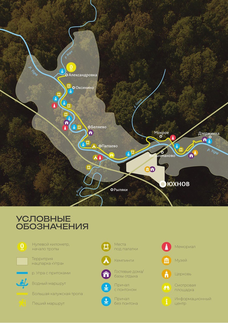 Большая Калужская тропа – это общественный проект, который направлен на развитие активного туризма в регионе. До 2025 года планируется создать 200 км пешего маршрута в долинах самых живописных рек Калужской области – Угры, Оки и Жиздры вдоль всей территории национального парка «Угра». Вместе с пешим будет оборудован водный маршрут, который откроет прекрасные ландшафты национального парка с нового ракурса – с воды. Часть пути будет предназначена для велосипедного трека. Тропа пройдет по Юхновскому, Дзержинскому, Перемышльскому, Козельскому районам и Калуге.