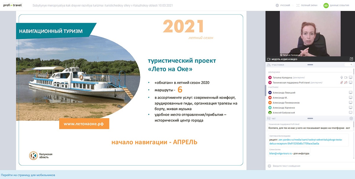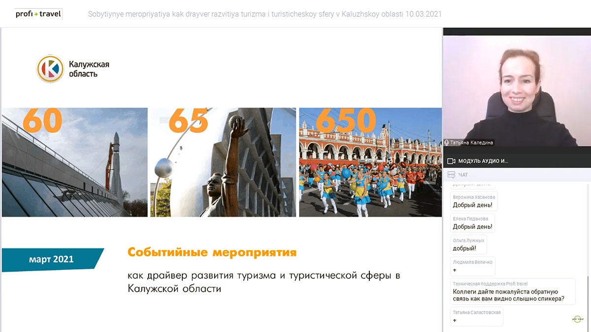 10 марта начала работу онлайн-выставка для профессионалов турбизнеса "ЗНАЙ НАШЕ: ЛЕТО 2021". В этот же день руководитель Агентства по развитию туризма Калужской области Татьяна Каледина открыла работу калужского стенда, рассказав в рамках вебинара о главных региональных событиях сезона 2021. Более 300 специалистов сферы туризма в прямом эфире узнали о юбилейных датах, на которые область делает ставку в развитии событийного туризма. Апрель - 60-летие первого полета человека в космос, июль - 65 лет отмечает #городпервых (Обнинск активно продвигает свой юбилейный хештэг), август - 650 лет Калуге.