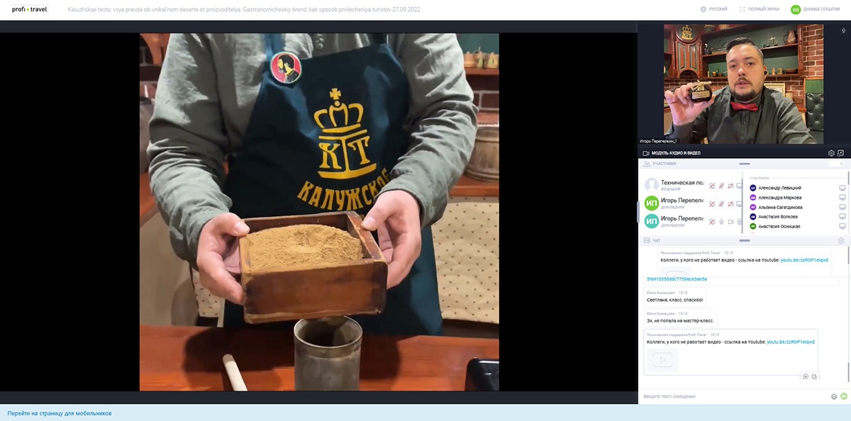 Завершающее калужскую презентацию выступление Игоря Перепелкина, владельца производства и фирменных пряничных заведений «Калужское Тѣсто», готовило для аудитории еще одно открытие: именно в Калуге можно попробовать уникальное блюдо, повторяющее рецепт первого в мире пряника. Баночка Калужского теста была разыграна среди слушателей и отправится удивлять туроператоров Вологды.