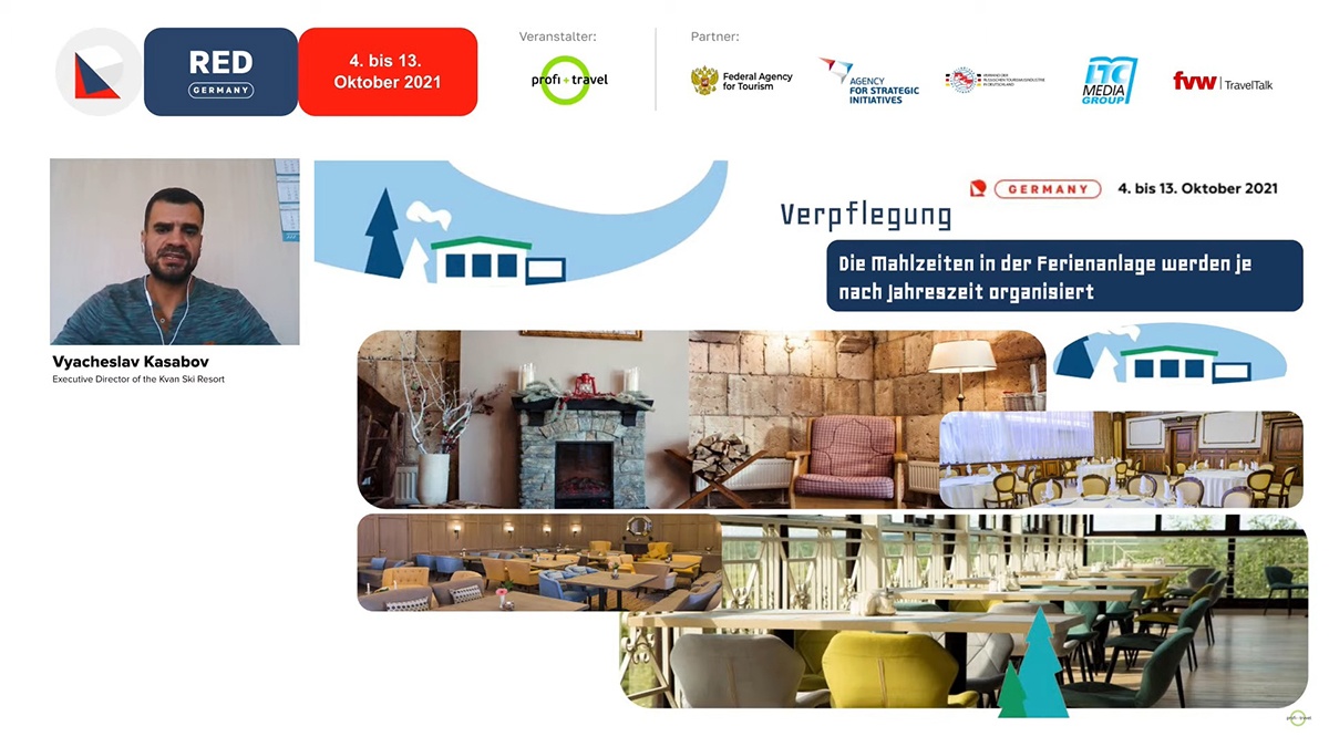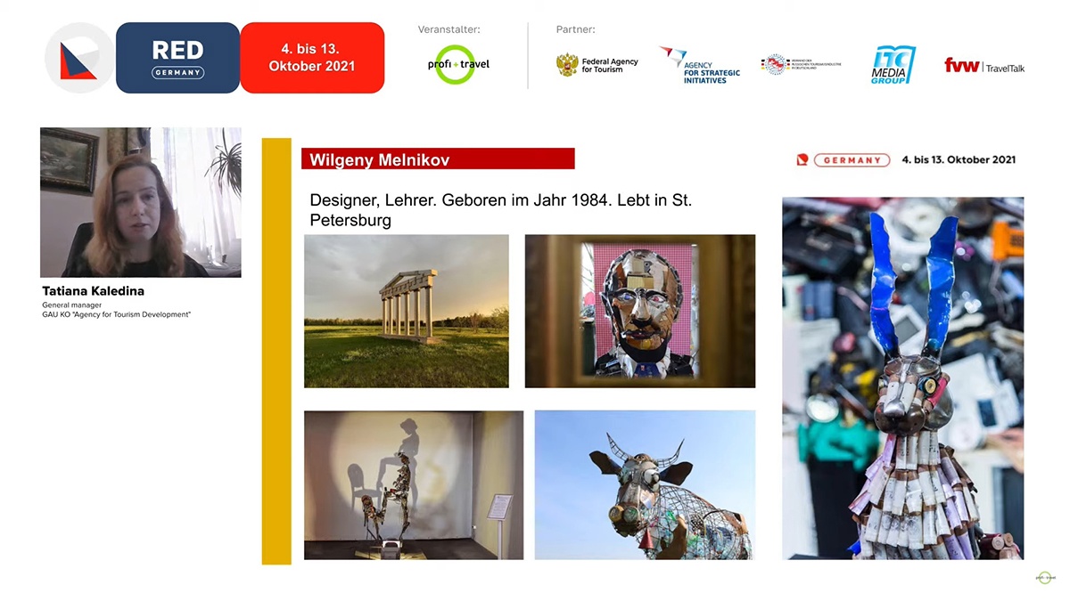 В рамках деловой программы проводятся онлайн-презентации возможностей отдыха в российских регионах для туристов из Германии, Австрии и Швейцарии. Эфиры RED Germany проходят с синхронным переводом на немецкий язык, они предоставляют регионам возможность наиболее комплексно и ярко представить свою территорию и свой туристический продукт вместе с представителями туристического бизнеса региона, выступающими в качестве соэкпонентов. С туристическим потенциалом Калужской области участники выставки познакомились 7 октября.