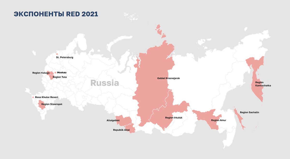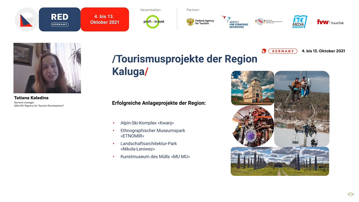 Мероприятие направлено на стимулирование роста въездного турпотока через B2B-канал, поддержание интереса международного сообщества к туристическому продукту российских регионов, эффективное и полное его представление, обеспечение возможности прямой деловой коммуникации и поиска бизнес-партнеров. В RED Germany 2021 участвуют 10 российских регионов и известный горнолыжный курорт Роза Хутор. Агентство по развитию туризма Калужской области подготовило стенд региона и презентацию туристического и инвестиционного потенциала для последующего эфира. В качестве соэкспонентов к выставке присоединились Интерактивный музей бумаги «Бузеон», парк-музей «ЭТНОМИР», арт-парк «Никола-Ленивец», Художественный музей мусора «МУ МУ», горнолыжный комплекс «Квань» и национальный парк «Угра».