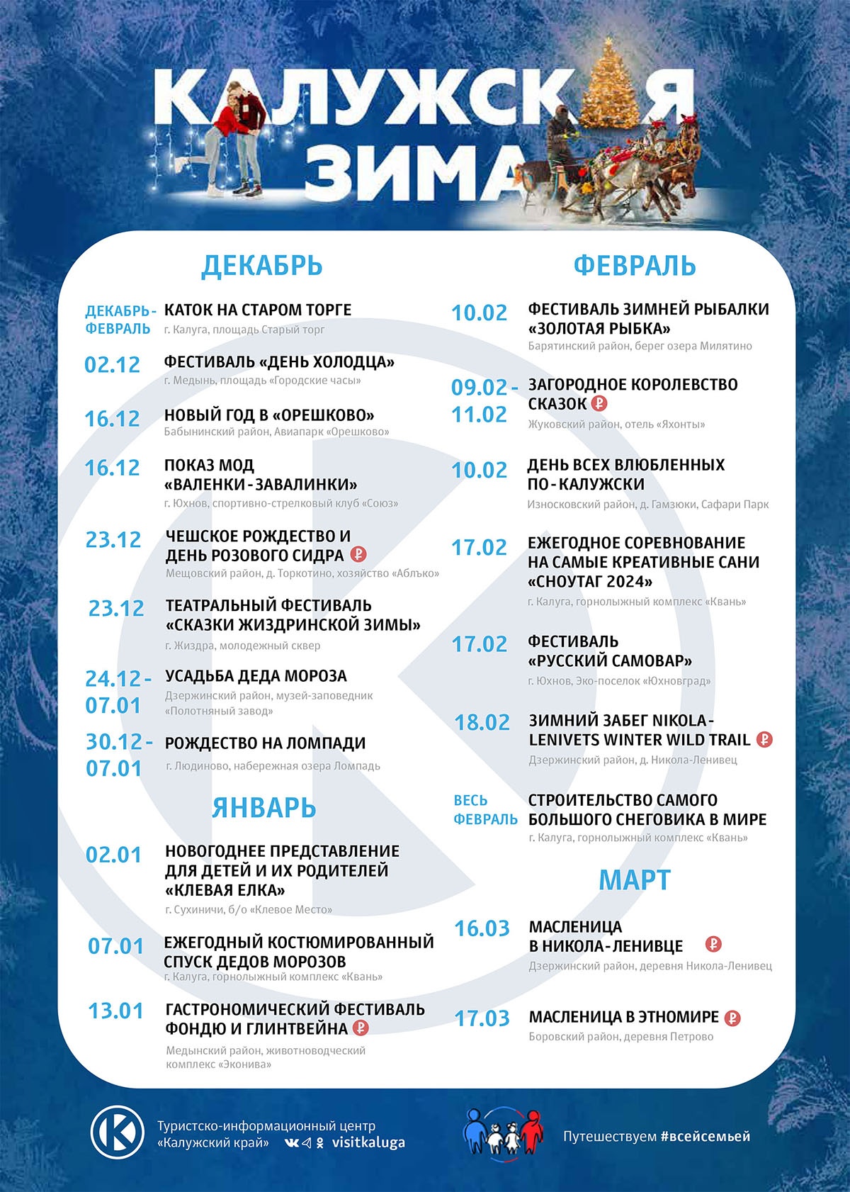 На данный момент сформировалась афиша Калужской зимы 2023/24, и первые строчки уже анонсируются организаторами отдельно. Проект охватывает календарную зиму и завершится традиционной Масленицей. Афишу составили как бесплатные мероприятия, доступные для всех, так и коммерческие, организуемые базами отдыха.