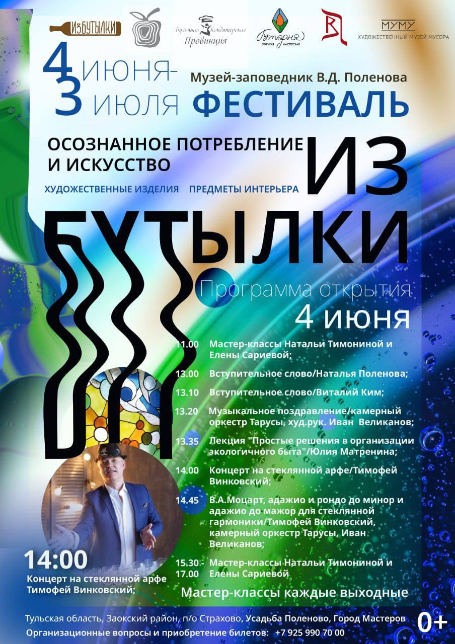 На открытии фестиваля «Из Бутылки» 4 июня в 13:00 в концертно-выставочном зале Город Мастеров усадьбы Поленово выступит виртуоз на бокалах Тимофей Винковский и Тарусский камерный оркестр под управлением Ивана Великанова. Входной билет - 300 рублей, оплачивается в кассе Города мастеров. Дети до 18 лет бесплатно.